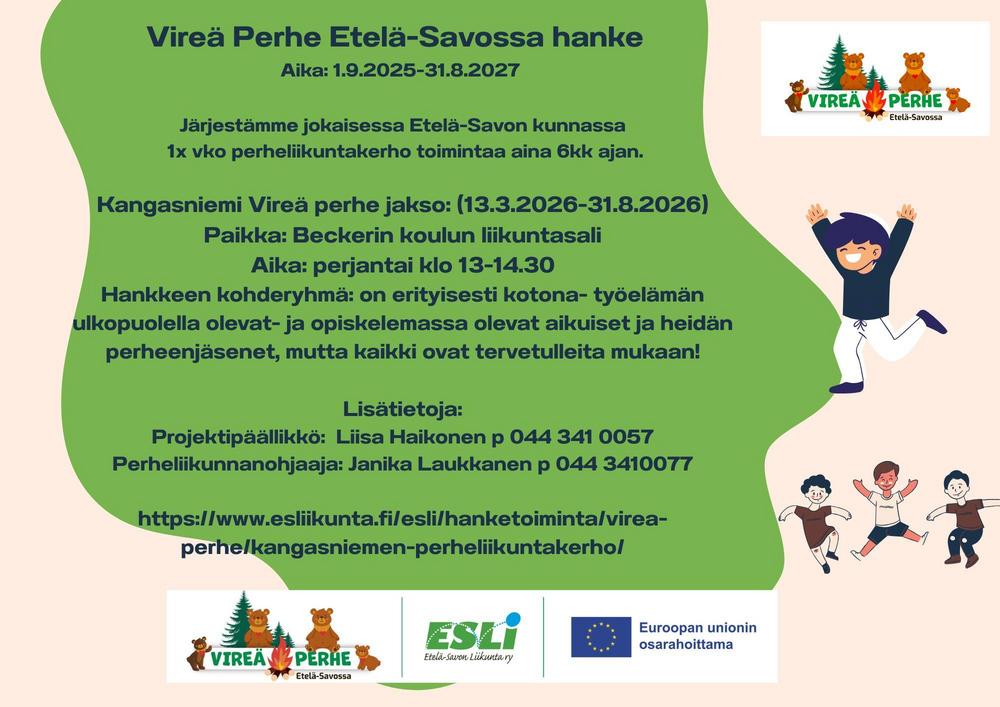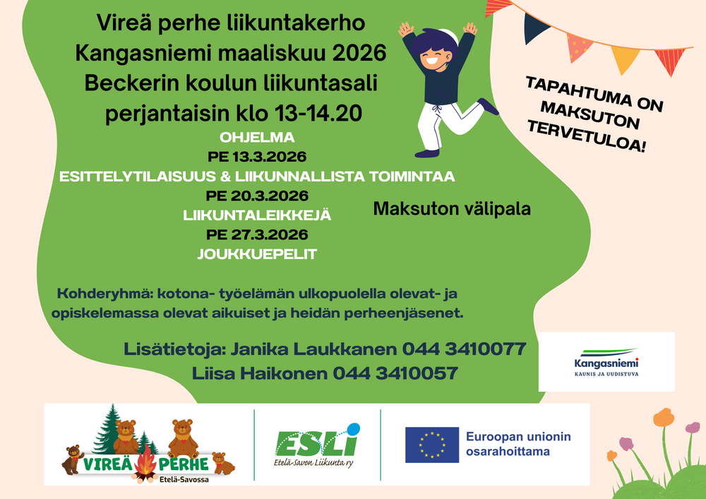 Kangasniemen perheliikunta kerho kokoontuu perjantaisin Beccerin koululla 13.3.2026 alkaen klo 13-14.20.