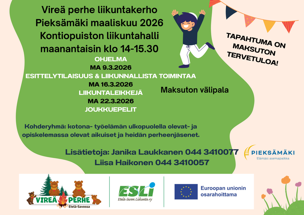 Pieksämäen Vireä Perhe hankkeen perheliikuntakerho starttaa viikolla 11.