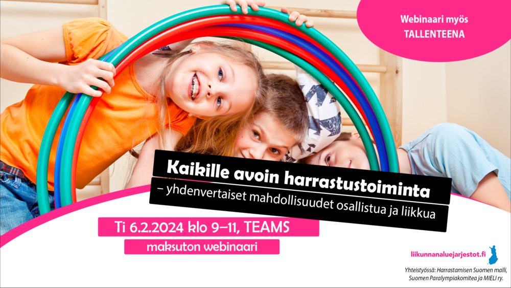 Liikuntatilassa soljuu kolmikielinen puheen sorina. Muutama istuskelee penkillä, osa liikuskelee ja kirmailee taukoamatta. Joku kurkistelee verhon takaa. Peli- ja leikkitilanteet herättävät suuria tunteita suuntaan ja toiseen. Kuulostaako tutulta? Ilmoittaudu mukaan! Webinaarissa saat tietoa ja käytännönvinkkejä, miten ohjaajana tai toiminnan järjestäjänä huomioit erilaiset liikkujat.