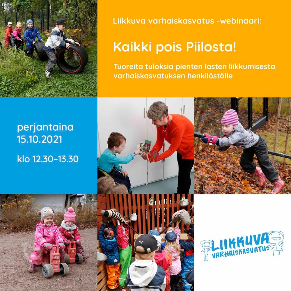 Varhaiskasvatuksen henkilöstölle suunnatussa webinaarissa avataan tuoreita tuloksia Piilo-hankkeesta, jossa tutkimuksen kohteena olivat pienten lasten liikunnan ilo, fyysinen aktiivisuus ja motoriset taidot. Paljonko lapset liikkuvat varhaiskasvatuspäivän aikana? Millaista tietoa saatiin motoristen taitojen mittauksista? Miten tuloksia ja hankkeessa kehitettyjä työkaluja voidaan hyödyntää varhaiskasvattajien arjessa? Lisää tietoa hankkeesta Likes-tutkimuskeskuksen verkkosivuilla.