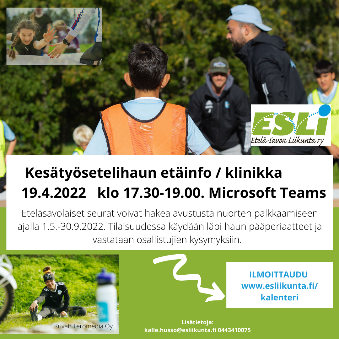 Kesätyösetelituki on tarkoitettu 15-29 -vuotiaan nuoren palkkaamiseen Etelä-Savon Liikunnan alueella vähintään kahden viikon ajaksi aikavälillä 1.5.–30.9. ja on suuruudeltaan 700 euroa/nuori. Tukea voi käyttää sekä palkkaan, että sivukuluihin. Seura voi hakea yhtä tai useampaa työllistämisseteliä, mutta yksi nuori voi käyttää vain yhden setelin. Kahden viikon työaika voidaan pilkkoa pidemmällekin ajalle, jos työpäiviä tulee esimerkiksi vain kerran viikossa.