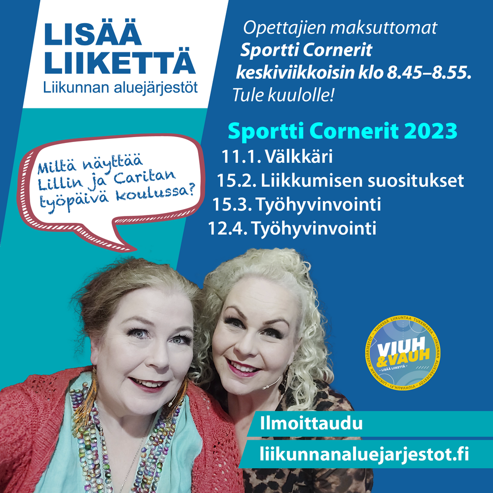 Liikunnan aluejärjestöt järjestävät kuusi aamuista Sportti Corneria, joista saat nopeasti ja vaivattomasti vinkkejä koulupäivän liikunnallistamiseen, työhyvinvointiin ja välkkäritoimintaan.