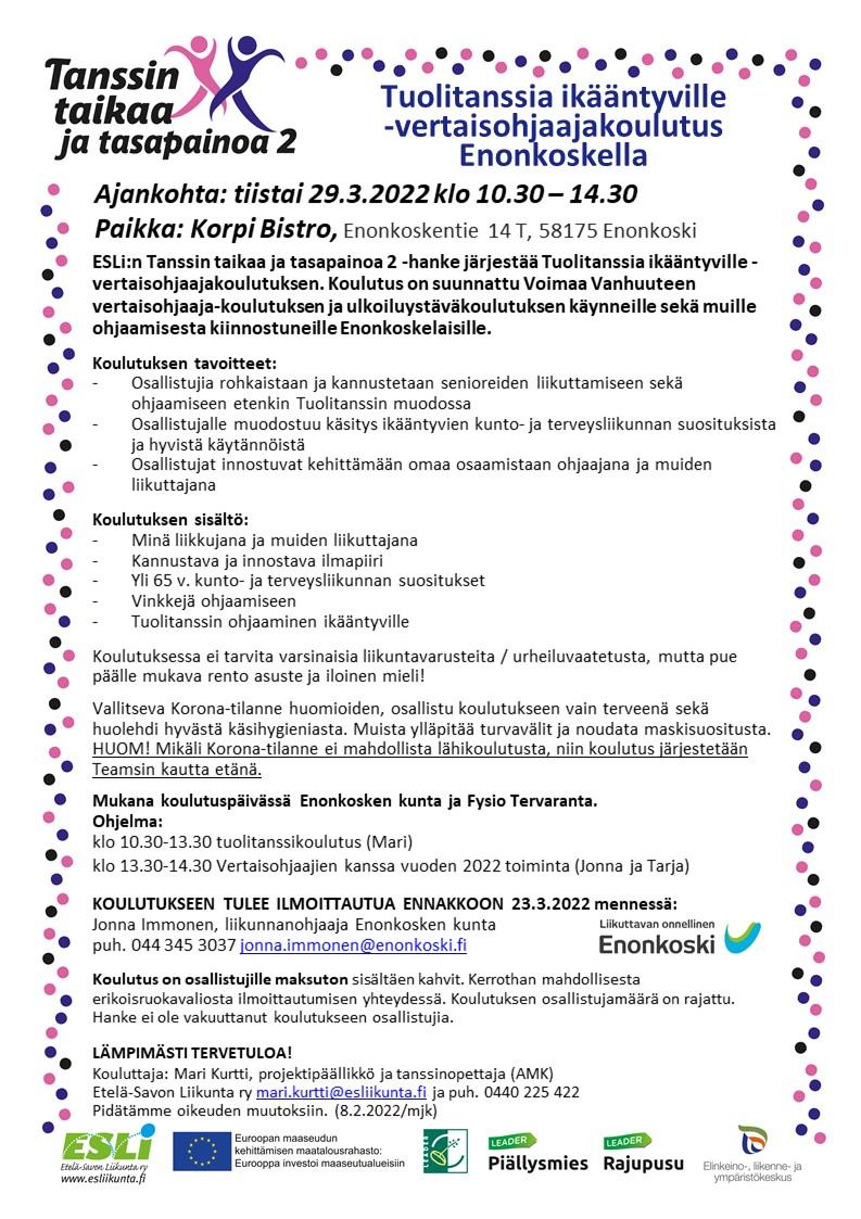 ESLi:n Tanssin taikaa ja tasapainoa 2-hanke järjestää Tuolitanssia ikääntyville -vertaisohjaajakoulutuksen yhteistyössä Enonkosken kunnan ja Fysio Tervarannan kanssa. Koulutus on maksuton osallistujille.