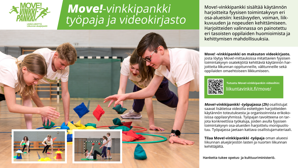 Työpajassa pääset tutustumaan Move!-vinkkipankin käytännön harjoitteisiin ja saat vinkkejä Move!-vinkkipankin harjoitteiden käytännön organisointiin.