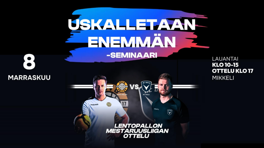 Ja huipennuksena: päivän päätteeksi sytytämme liikunnan energian katsomossa, kun Savo Volley tuo Road Shownsa Mikkeliin ja kohtaa AC Oulu Volleyn Mestaruusliigassa klo 17. Yksi päivä, kaksi huippuelämystä – keskusteluista katsomotunnelmaan!
